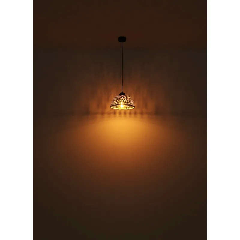 Ova prelepa plafonska lampa inspiriše sjajnim dizajnom. Iz okruglog plafoskog nosača istureno je grlo E27 koje je prekriveno oblikovanim abažurom (Ø35 cm) napravljenim od bambusa u sjajnim prirodnim bojama. Grlo E27 vam omogućava da sami odredite intenzitet svetlosti i jačinu do maksimalne snage od 40 vati. Zbog trajnosti i uštede energije preporučujemo LED sijalice.