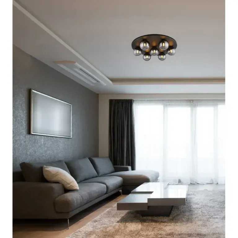 Plafonska lampa RIHA ima okrugli dizajn definisan sa 7 dimno sivih staklenih kugli. Telo lampe je od crnog lakovanog metala sa mat završnom obradom. Ovaj elegantan izgled dopunjuje abažur od staklenih kugli, koji stvara posebnu atmosferu. Dimenzije plafonske lampe RIHA su ø 600 mm, što je čini idealnim rešenjem za prostorije srednje veličine. Sa efektivnim svetlosnim tokom od 130 lumena i temperaturom boje od 3000 K, plafonska lampa RIHA pruža prijatno osvetljenje. Sa minimalističkim dizajnom i elegantnim abažurima od staklenih kugli, plafonska lampa RIHA postaje stilski dodatak za svaki enterijer.