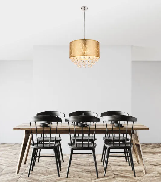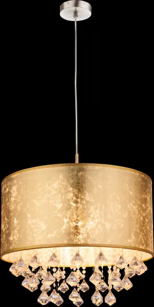 Upečatljiv luster-visilica AMI ističe se svojim dizajnom i materijalima. Odlična izrada i odličan kvalitet. Mat okvir od nikla, abažur od tekstila zlatne boje (40 cm) i viseći kristali čine ga privlačnim za oko u svakom životnom prostoru. E27 grlo vam omogućava da izaberete željenu sijalicu, a time i intenzitet svetlosti i temperaturu boje svetlosti. Zbog dugovečnosti i niske potrošnje energije preporučujemo LED sijalice.