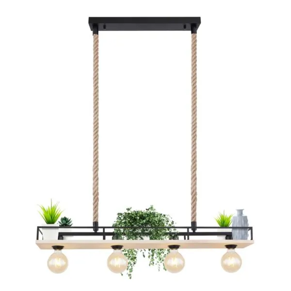 Ova rustična visilica savršeno se uklapa u vaš enterijer. Dugačka 95 cm, sastoji se od drvene ploče koja visi sa plafona na crnom metalnom okviru, uokvirenom dvema sajlama sa konopcem od jute. Četiri E27 grla u drvenoj ploči omogućavaju korišćenje sijalica po vašem izboru, dajući vam mogućnost da sami odredite boju i jačinu svetla. Pored toga, visina visilice može se prilagoditi do 120 cm tokom instalacije. Sa dodatnim proizvodima iz iste serije, možete upotpuniti celokupan izgled svog prostora.