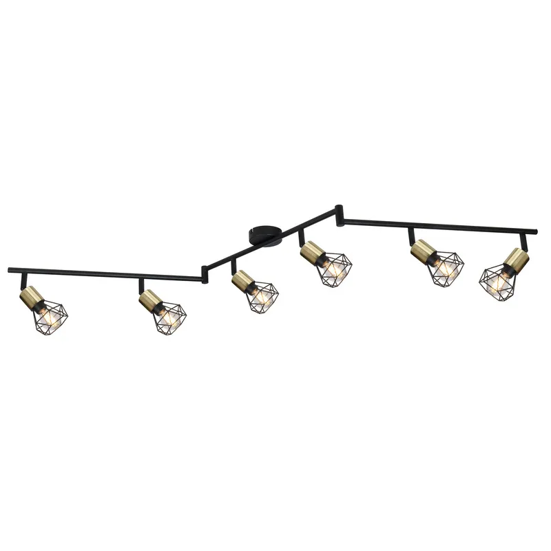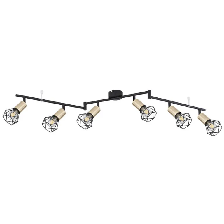 Ova plafonska lampa serije XARA I je savršena za vaš dnevni boravak. Reflektor dužine 116 cm sastoji se od tri crne metalne grane, od kojih svaka ima dva okretna grla E14, u boji starog zlata sa metalnim mrežastim abažurima. Možete ih opremiti odgovarajućim sijalicama po vašem izboru, što vam daje mogućnost da u skladu sa svojim idejama odredite boju svetla i jačinu. Sa ostalim modelima iste serije možete upotpuniti celokupnu sliku u svoja četiri zida i obezbediti elegantan ambijent.